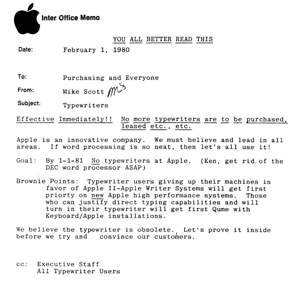 “By 1-1-81, no typewriters at Apple. We believe the typewriter is obsolete. Let’s prove it inside before we try and convince our customers.”